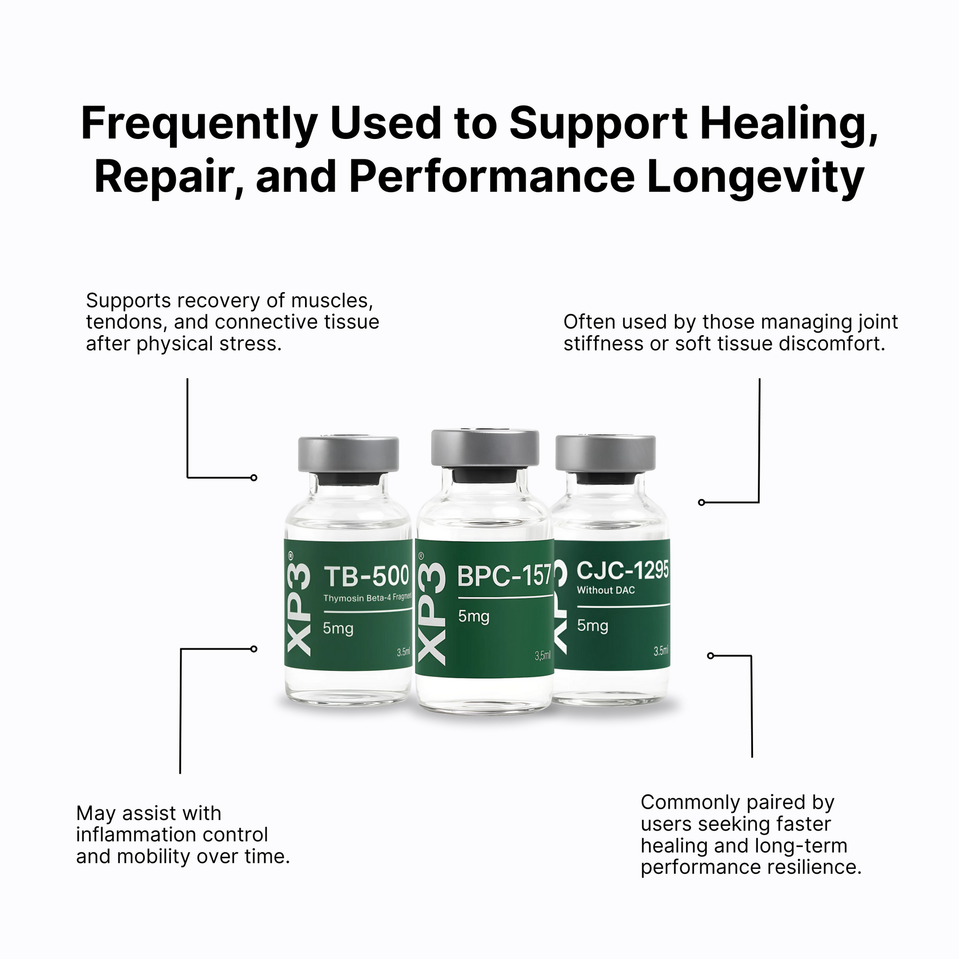 Users often choose this trio to support joint and connective-tissue healing. The stack promotes collagen synthesis and blood flow to injured areas, which can enhance cartilage and tissue regeneration – ultimately supporting better joint function and mobility as one heals.